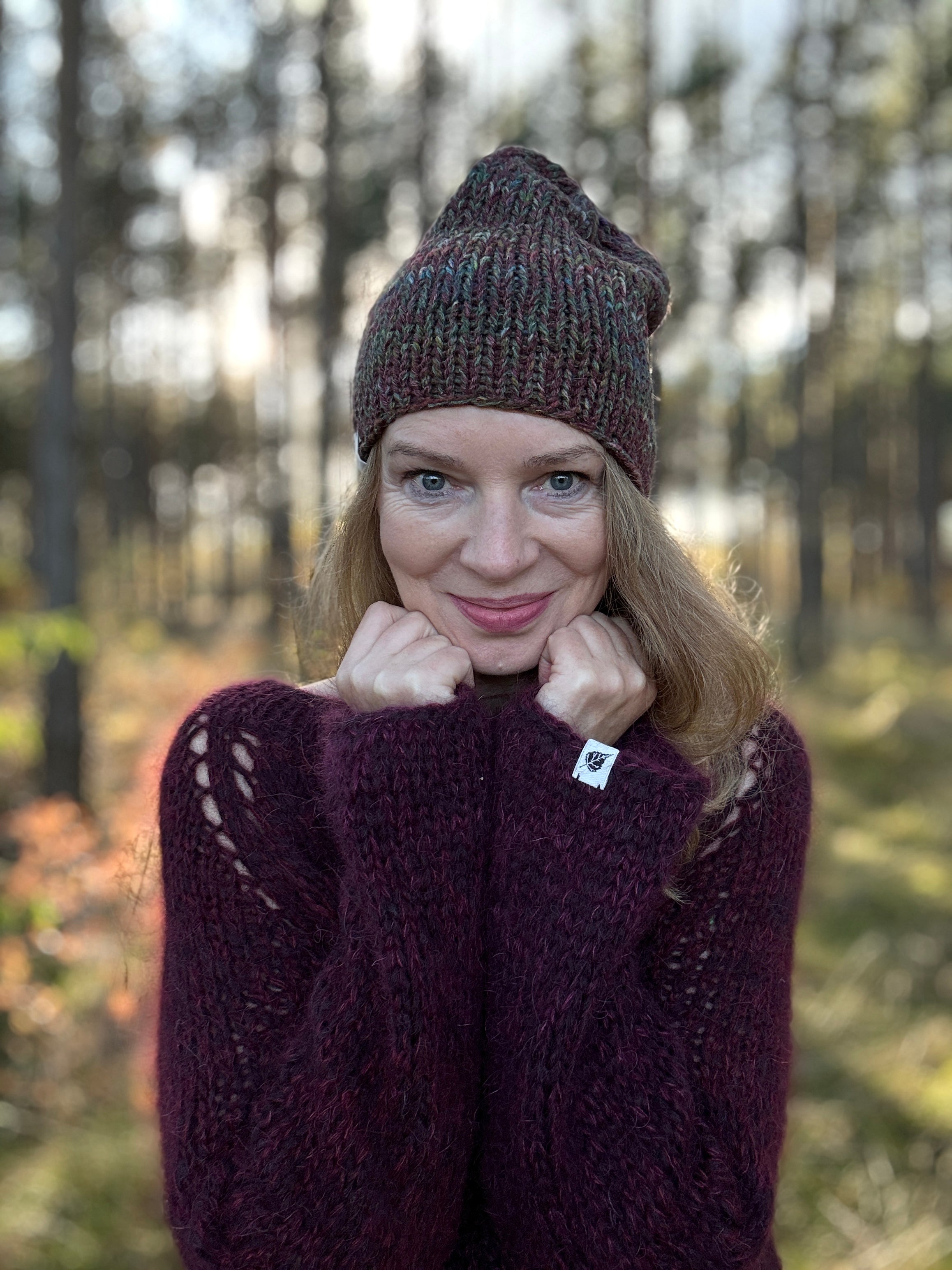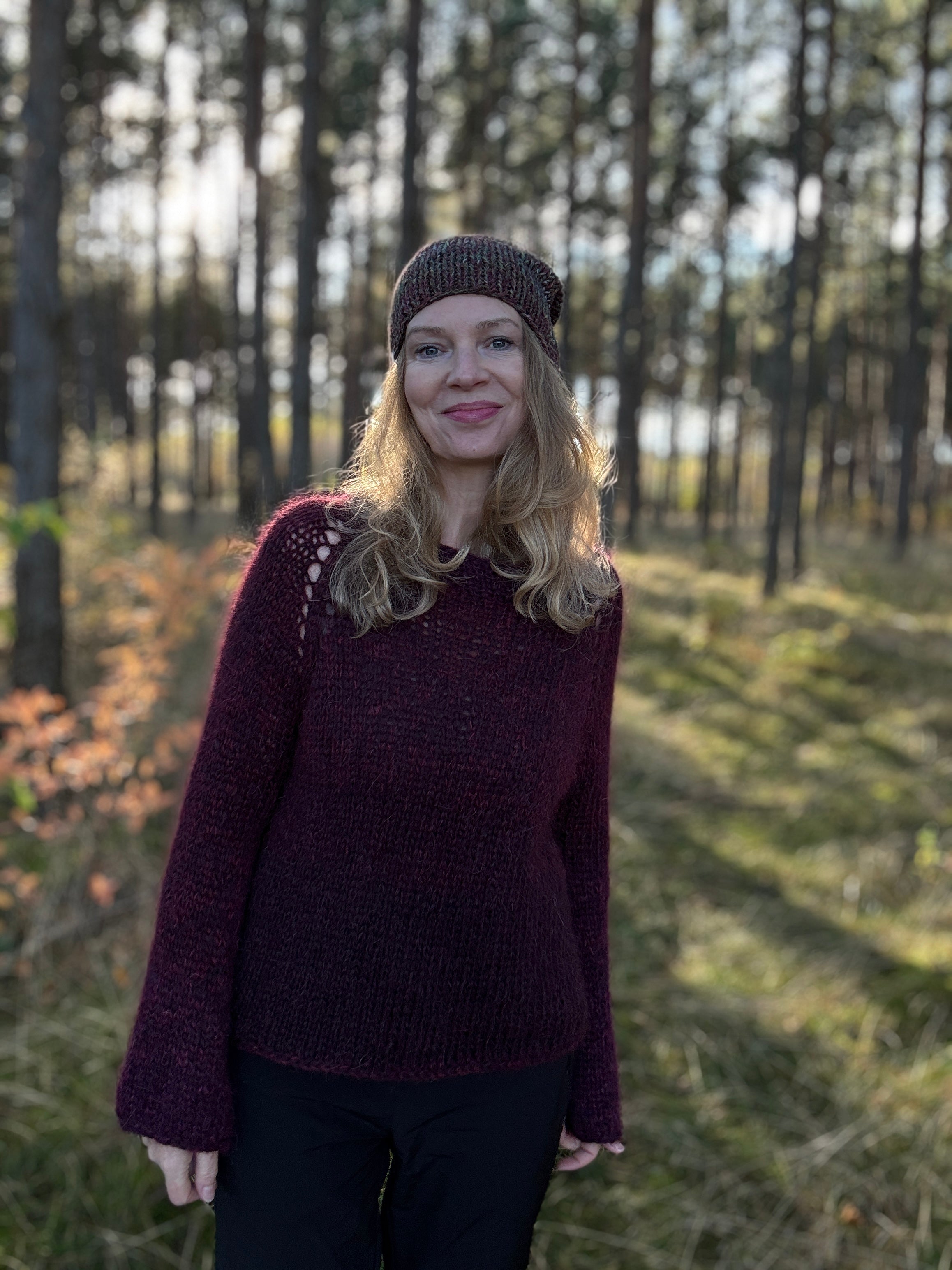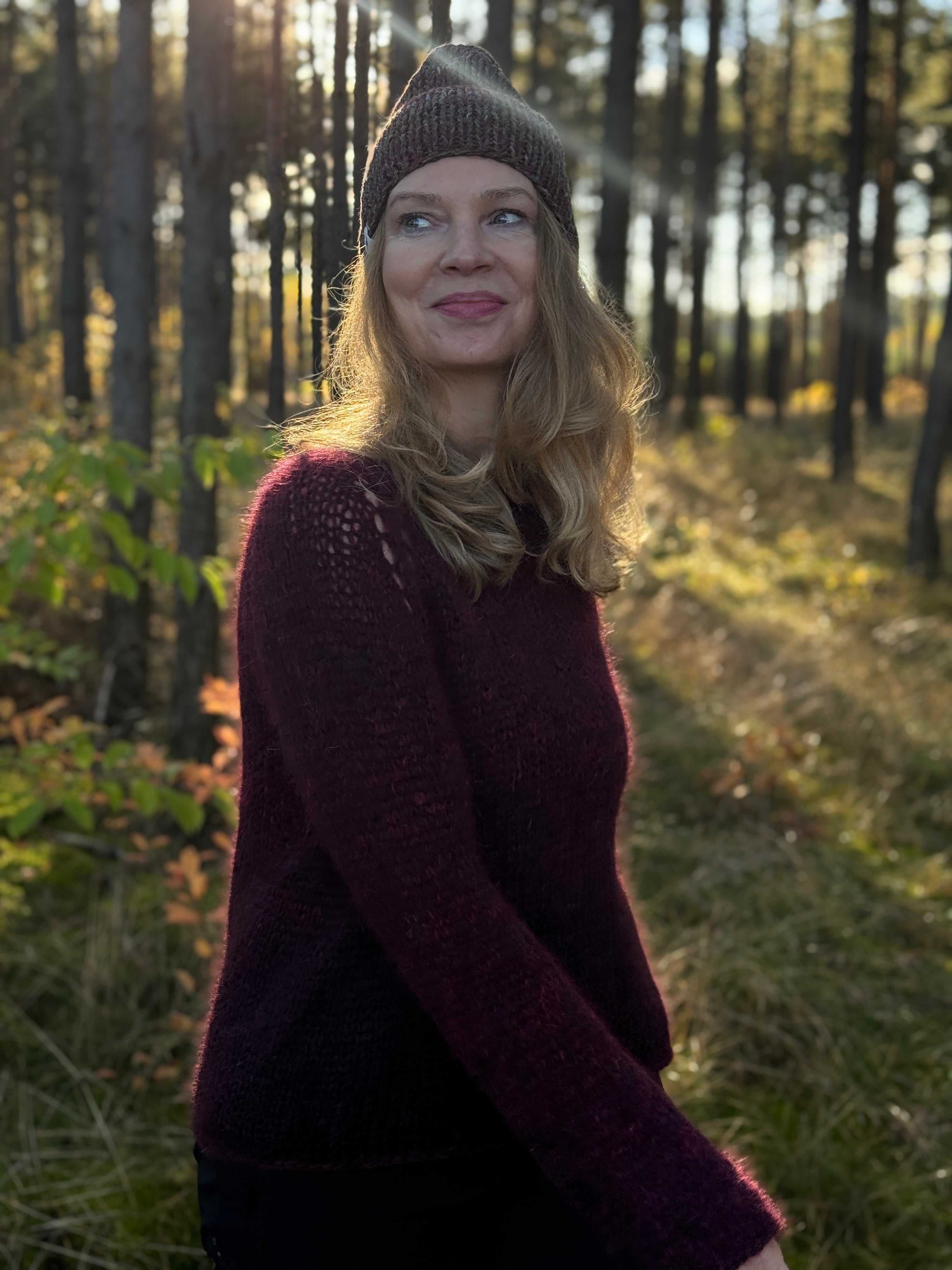 Oto sweter, które jest zdecydowanym faworytem sezonu. Kolor czerwonego wina, dojrzałych winogron, bakłaźana…kolory delikatnie wibruja i przenikaja siè wzajemnie. Dół swetra ma ton ciemniejszy, barwienie typu ombre.